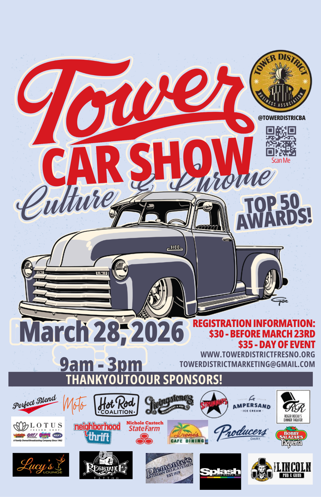 Join us for Culture & Chrome in the Tower District on March 28th from 9 AM to 3 PM! Celebrate automotive culture with classic cars, modern vehicles, local vendors, and restaurant specials. Pre-register for just $30 or pay $35 the day of the event. Enjoy live music, family-friendly activities, and compete for up to 50 awards, plus raffle prizes and giveaways. Whether you’re a car enthusiast or just looking for a fun day out, there’s something for everyone!